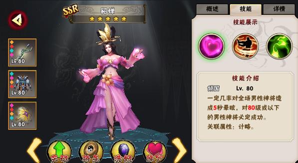 二技能被动,提升己方部队的攻强。作为一个弓兵貂蝉没有输出能力,即使70级满级攻强也不过只加了332点,不能说坑也不能说强,算是中规中矩吧。