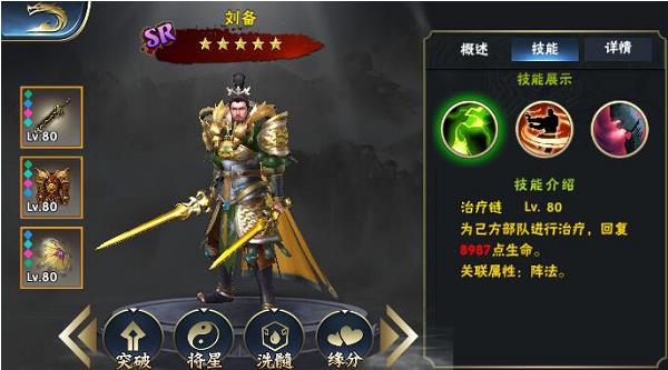 刘备的三技能则是刘备的辅助技能是一个瞬间补满神将的怒气,这个技能可以给很多SSR武将续航不可谓不强刘备的三技能使刘备奠定了最佳辅助的位置。一个自身有回复,部队有伤害的辅助加肉不可谓不强。