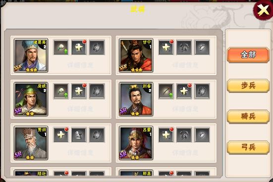一、武将属性1.点击“武将”按钮,会弹出武将属性界面,可以看到所有已经拥有或未拥有武将,以及武将所对应的兵种