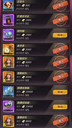 3、地产商店里,Gakki碎片、计划书以及扩建许可证,是每日必买的,其次是冯小莫碎片、金怀表、银怀表、注资卡,地产币比较富裕的话最后可以购买住宅蓝图。