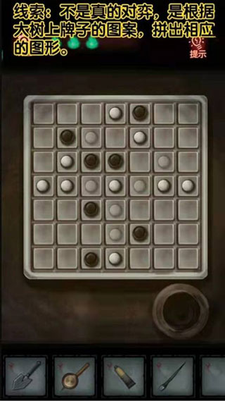4、把白色棋子放进棋罐,根据木牌线索用白棋摆出伞的形状,得到钥匙。