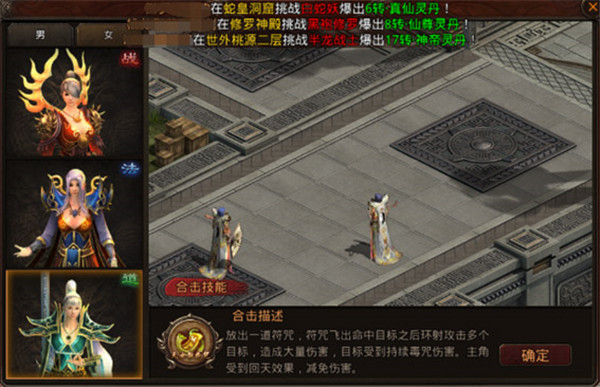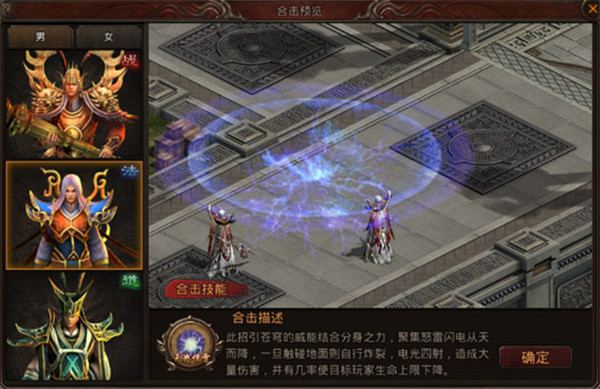 合击技能-怒斩天下:对前方敌人造成伤害,同时对目标后方角色造成贯穿伤害。有几率无视目标防御和消耗目标魔法值。