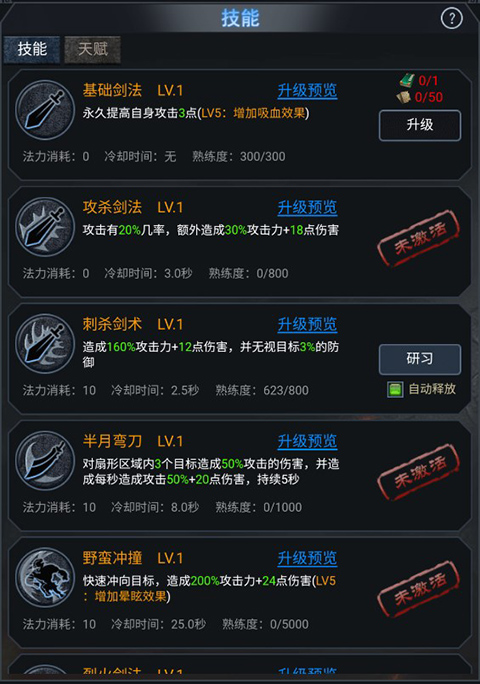 1、技能:游戏人物有着丰富的技能可以研习,研习后的技能可以进行升级提升,增加基础伤害和属性加成。