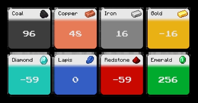 1、矿石分布;这是一个简单的图表,展示了自更新1.21洞穴与山崖地形、群系、建筑高度重塑之后,所有矿石在《我的世界》Y轴坐标下的最佳分布。正如你所看到的那样,煤炭要去96层,挖铜要去48层,铁矿石在16层,金矿石-16层,钻石-59层,红石-59层,青金石0层,绿宝石256层。所以对于喜欢挖钻石的玩家而言,很简单只需要你挖到地底即可疯狂的推图。