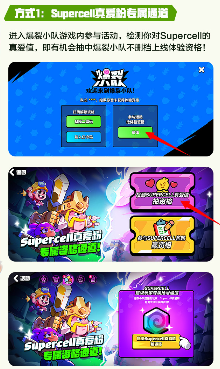 进入爆裂小队游戏内参与活动,检测你对Supercell的真爱值,即有机会抽中爆裂小队不删档上限体验资格。