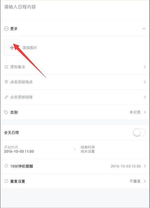 2、然后,在下图方框中的位置,添加所需提示的内容,这里就不多做介绍了,对于那些愿意用图片表达日程安排的人来说,添加图片的方式更加快捷方便。其实,365日历也是可以添加图片提醒的,这里需点击图上箭头所示的位置