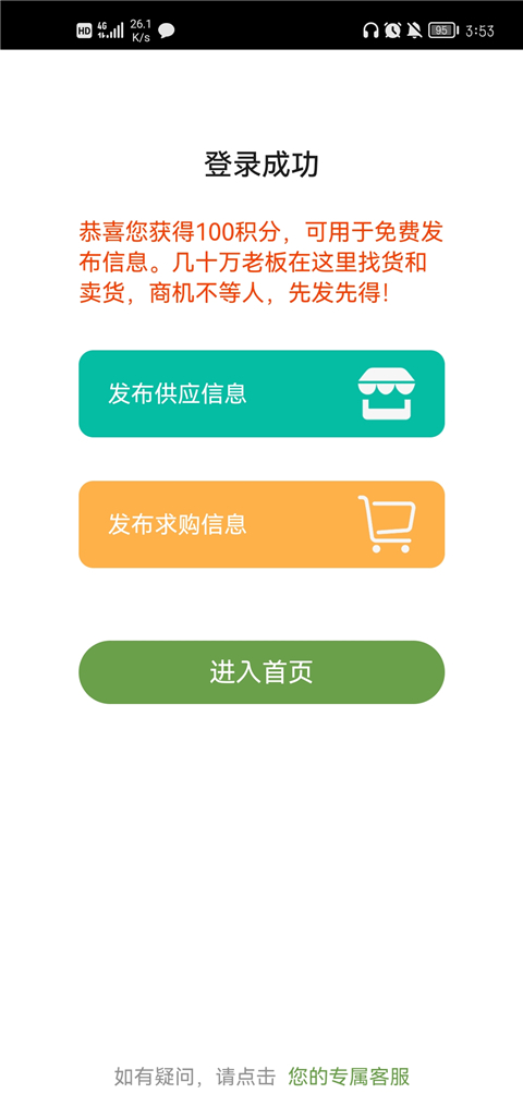 2、用户可以选择发布供应信息或者求购信息,也可以直接进入首页。