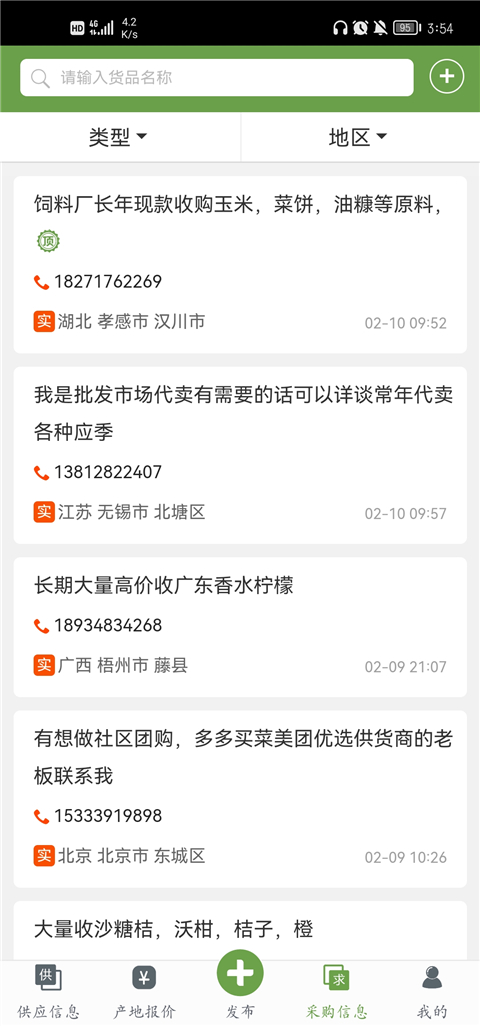 该软件汇集了海量优质的农产品供求信息,农产品的种类也非常丰富,可以满足用户的多重采购需求,平台里各色农产品基地会为用户提供最新的价格行情,各生产基地的农户或经纪人也会直接发布的一手资源信息,产地直供,真实可靠,便宜货可以放心通过该软件进行交易,非常的方便。