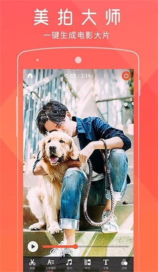 美拍大师app是一款手机短视频美化制作软件,由知名的美图公司推出。软件完全颠覆传统视频制作软件,操作简便但功能很强大,能够轻松快速的一键生成电影大片。在软件中,用户可以为视频加上特效滤镜、转场动画、字幕配乐,让你的视频瞬间变得高大上。目前软件能够支持数十种特效,无论你是喜欢文艺小清新风格还是唯美风,美拍大师app都能够充分满足你的视频制作需求。这里还有非常有个性的动态字幕可以供用户选择,有了美拍大师,每个人都有可能成为大导演。还等什么,赶紧来下载体验吧。