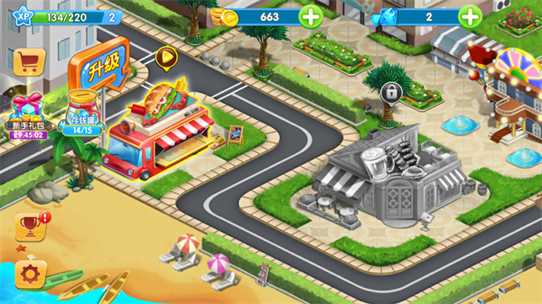 游戏一共有40关,每过一关才能解锁下一轮和升级,每一关系统分配的赚钱目标的收益都会有所递增,以及能否解锁拥有先进的厨房灶具和忠实的顾客等。而厨房升级最为重要,直接影响你店铺的出餐效率。下面小编以美食快餐车为例。