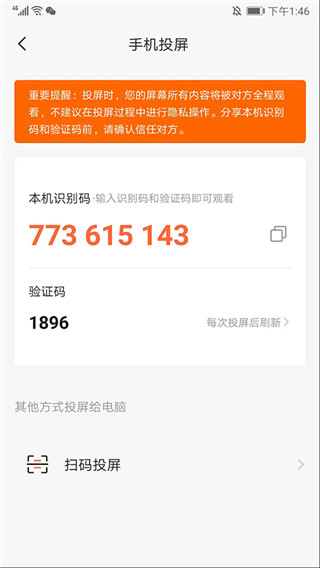 6、可通过输入识别码和验证码进行连接投屏,也可以通过扫描进行投屏;