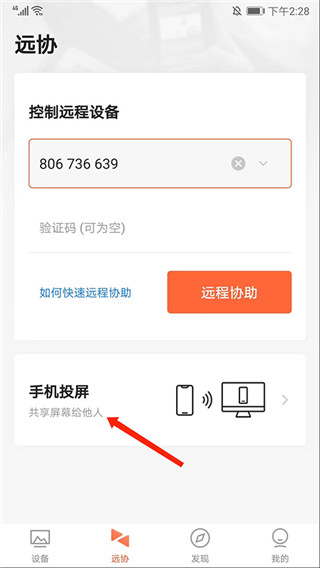 1、打开向日葵企业版APP,在【远协】界面可进行控制远程设备和手机投屏;