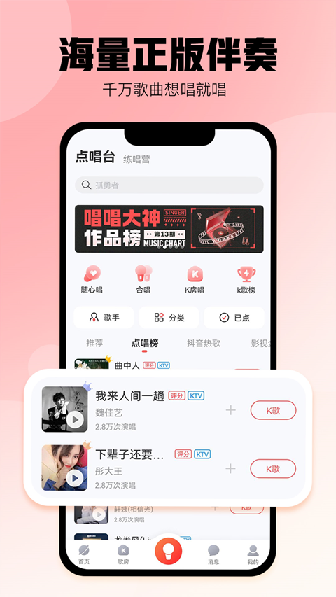 酷狗唱唱K歌App是一款专为喜欢唱歌和听歌的用户打造的在线K歌平台,拥有海量高品质伴奏和多种顶级音效,让用户随时随地都能享受专业级的K歌乐趣。软件依托酷狗正版曲库,提供了丰富的歌曲资源,并支持智能打分、K歌直播、好友互动等多种玩法,让用户的娱乐生活更加丰富多彩。界面设计清爽简洁,操作简单方便,没有任何广告干扰,用户可以轻松实现听歌、唱歌、分享和社交等功能。