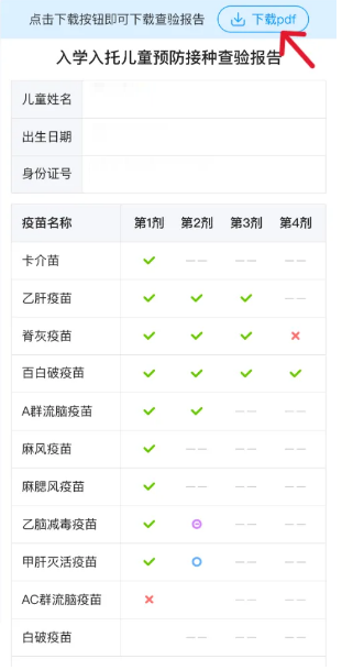 报告包含儿童姓名、出生日期、身份证号及已接种疫苗清单(如卡介苗、百白破疫苗等)。