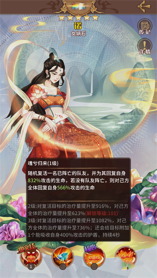 此外,另两个辅助的强度也同样在线,采薇和诺,前者能提供群体护盾,后者能提供群体治疗,而且这些护盾和治疗的攻击加成非常的夸张,特别是诺,其技能升满级后,加成直接突破1000%,基本上只要敌人没有禁疗效果,一个奥义下去己方全体就能直接回满血。