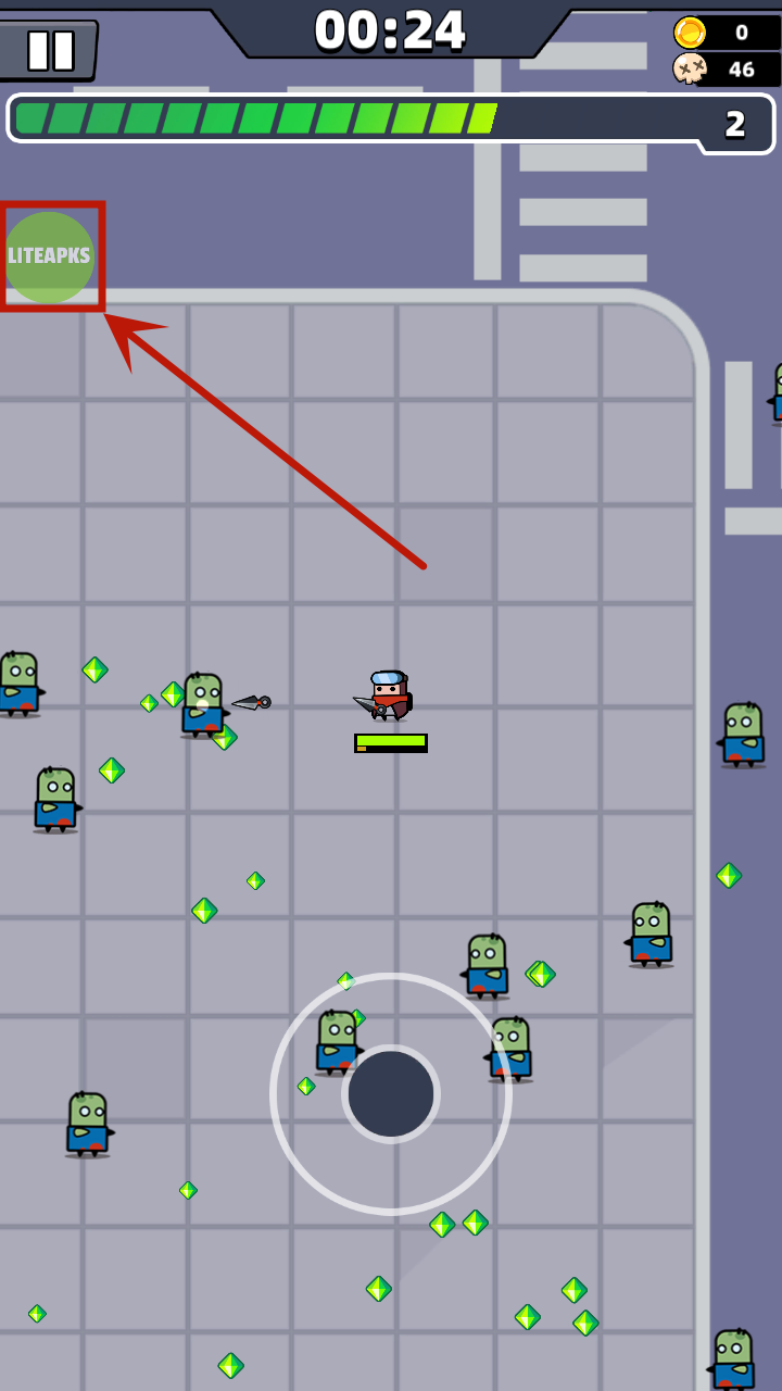 2、返回重新打开游戏,点击进入游戏内后,我们可以在游戏左上角看到写着【LITEAPKS】的圆形标志,这就是我们的菜单功能区。不得不提一嘴,游戏内的僵尸刷新真的很多很快。