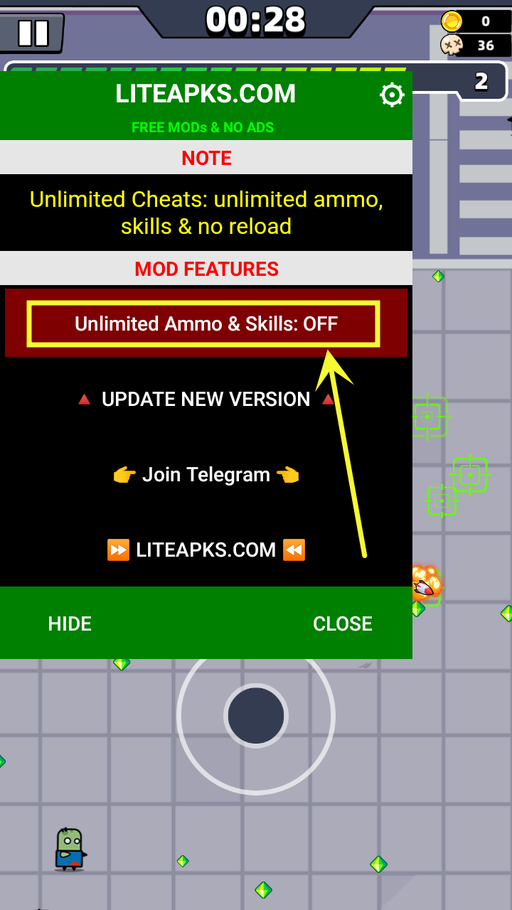 3、点击打开内置作弊菜单,在【Unlimited Ammo & Skills: OFF】这一行点击OFF切换为ON,无限弹药和技能模式就开启了。