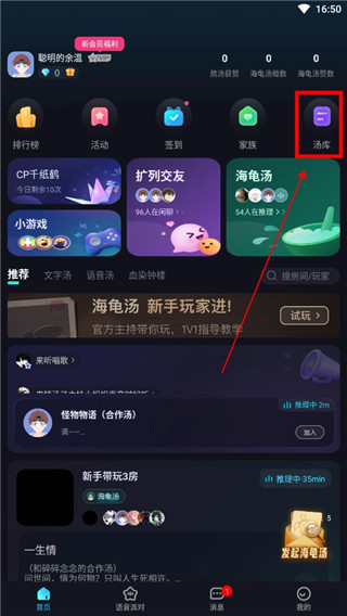 1、下载好app后,打开软件登录账号。进入后,点击右上方的【汤库】。