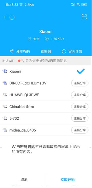 4、WiFi密码钥匙将截取您的屏幕上显示所有内容,选择立即开始