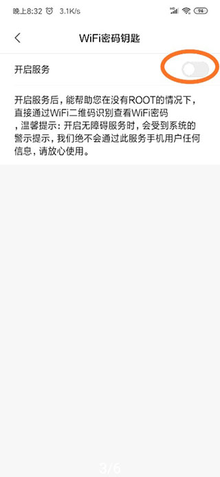 3、选择开启服务,开启后,能帮助您在没有root的情况下,直接通过wifi二维码识别查看WiFi密码