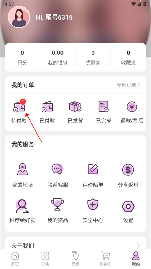 2、在"我的订单"栏目下,找到并点击“待付款”订单,查看当前未付款订单;