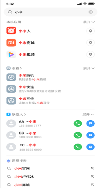 支持搜索应用、设置项、联系人、短信、便签、邮件、文件等丰富的本地数据。