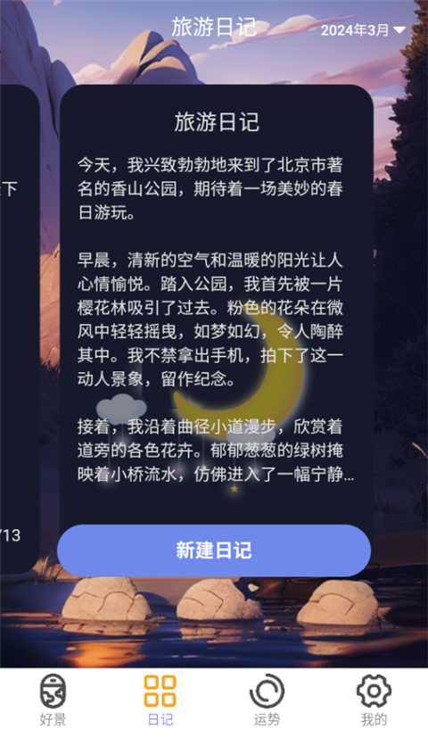 2、旅游日记:记录你的旅行回忆!好景充充的旅游日记功能让你可以随时随地记录旅行中的点点滴滴。你可以写下感受和体验,将每个独特的旅行时刻永久保存下来,让旅行的回忆永远充满阳光和美好。