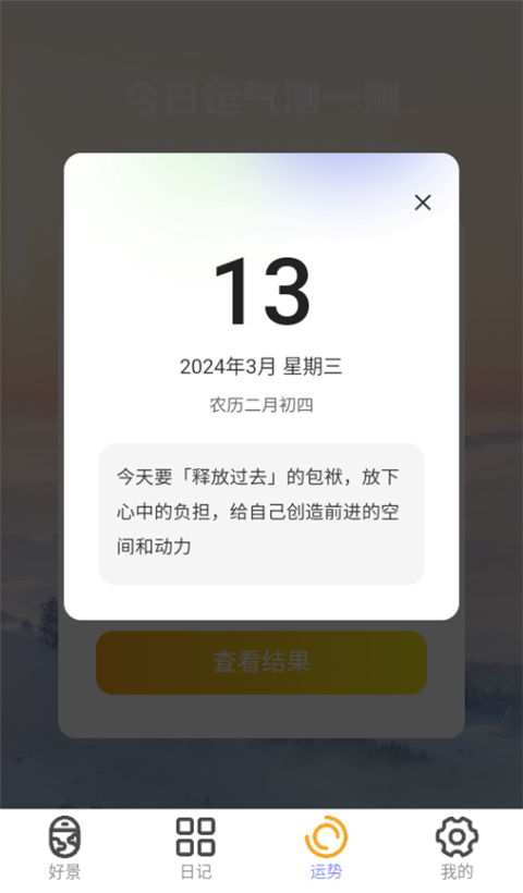 3、今日运气:想知道今天的运势如何吗?通过好景充充的今日运气测一测功能,你可以获取每日的运势预测。了解自己的今日运势,为你的旅行增添一份神秘和乐趣。
