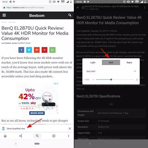 chrome://flags/#reader-mode-heuristics 启用此模式后,在用户指定的网页类型下(带有文章结构化标记/显示为文章/总是启用),在页面下方将显示一个"使网页适合移动设备"的按钮,点击此按钮,Chrome将会对当前网页重新排版为阅读模式。