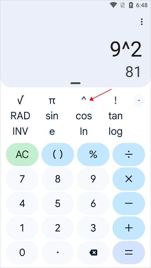 9、例如求9的平方可以点击指数键(下图红色箭头所指)