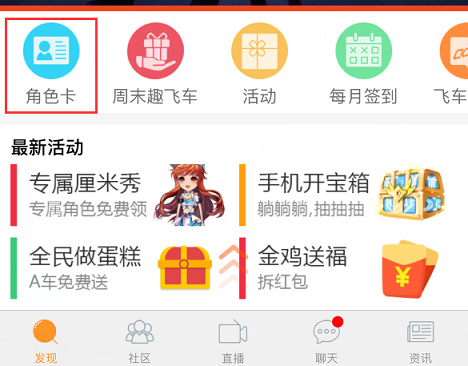 2、登录后,在首页“发现”,点击“手机开宝箱”/或者在首页“发现”,点击“角色卡”,然后点击“个人背包”,切换“宝箱”页签;