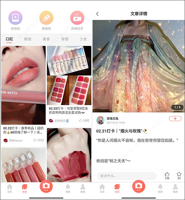 4、除此之外呢,在无他社区app中为大家提供了好玩的社交社区,在这里提供看口红、眼妆、美食、穿搭等各种内容,就有点类似与小红书。