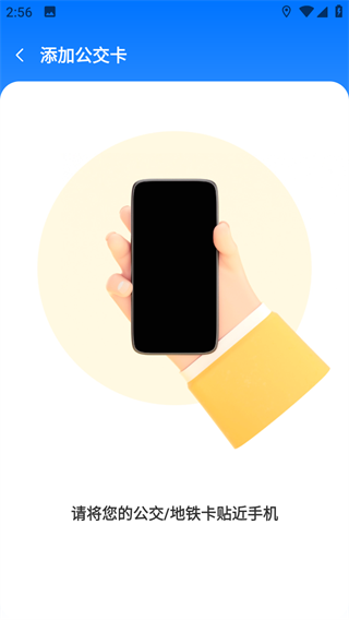 2、点击首页的添加公交卡;然后将已有的公交卡贴至手机背面,等待扫描;