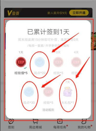 每周可以签到7天,在第2天、第5天、第7天签到时都可以领取阅点