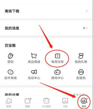 在“腾讯动漫” APP界面下方点击右下角的“我的”,再点击“百宝箱”栏下的“每周任务”图标