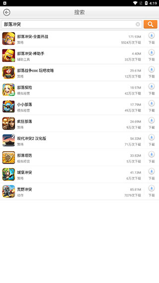 2、其次再点击首页上方的空白搜索框架,输入游戏的名称或关键字,例如部落冲突,进行一键搜索即可找到想要下载的游戏。