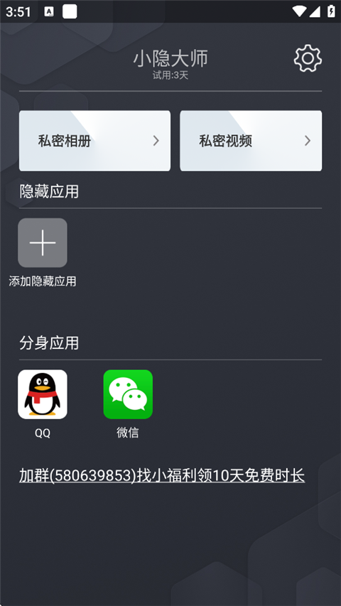 小隐大师app是一款收集隐私管理工具,提供分身多开助手、隐私相册等功能,全方位保护用户隐私。软件支持应用双开,用户可以双开微信或者QQ,其中二者中一个会外显,而另一个则隐藏起来,用户可将较隐私的微信设置为隐藏,一明一暗的强大功能保护个人隐私生活。