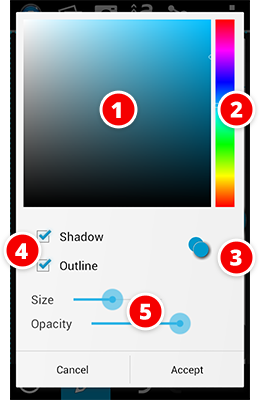 轻触中央的颜色渐变 (1) 选择颜色。您可以触摸右侧的垂直色谱条 (2) 调节色谱。当前和上次使用的颜色都会显示在渐变条下方 (3)。您也可以为所有支持的工具添加阴影和/或边框效果 (4),以及调节线条宽和透明度 (5)。