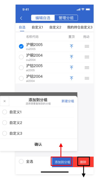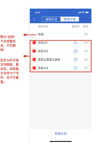 2、若有自定义分组,加自选时弹出“编辑分组”弹框,删自选时则从所有分组中删除该合约;