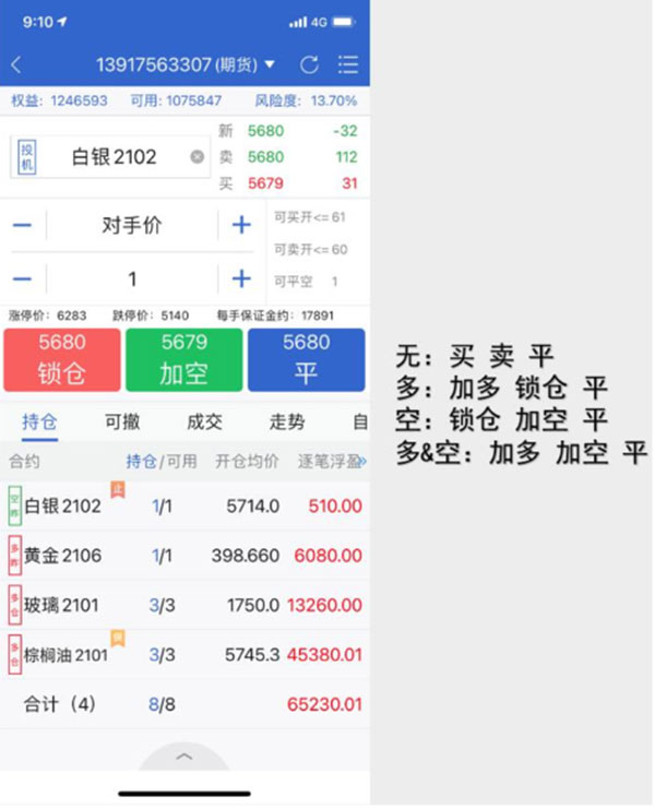 4、合约无持仓时,显示买(开)、卖(开)、平。根据合约持仓情况,显示:加多、加空、锁仓、平。