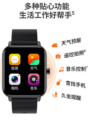 多种贴心功能,生活工作好帮手,天气预报、遥控拍照、音乐控制、查找手机、久坐提醒。