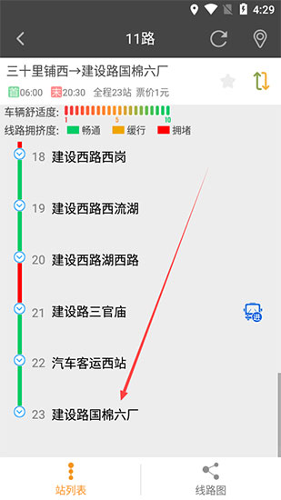2、在公交线路界面中点击你所在的车站,这里以建设路国棉六厂为例。