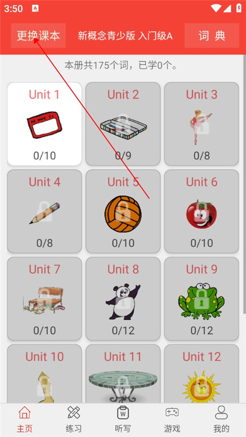 4、当用户学习完当前教材后可以点击更换教材选择其他教材进行学习。