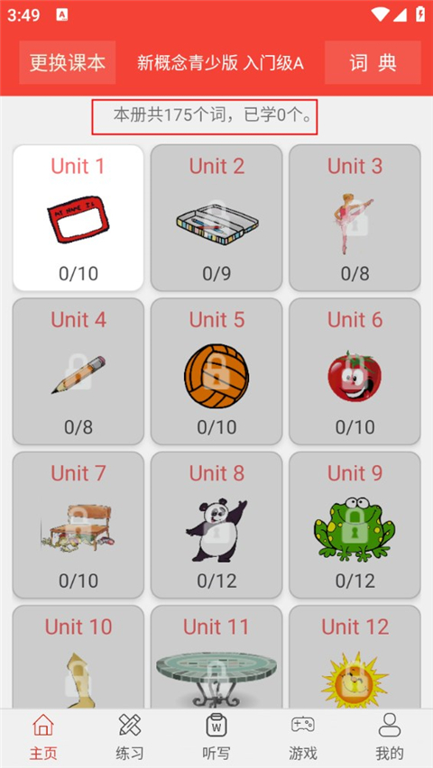3、选择之后就可以开始学习了,每册教材都有用户需要学习的词汇及单元课程。