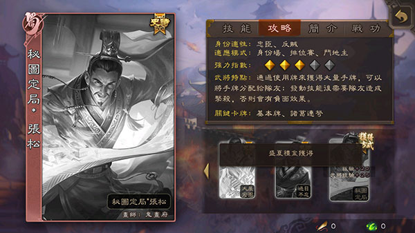 三国杀繁体版是一款由游卡官方正版授权,祺禧娛樂香港有限公司运营的桌游卡牌游戏。该游戏正如其名,以繁体中文为最大亮点。但与国内的正式版相比较来说,繁体版在模式和玩法方面同样继承了联网模式和单机模式两部分。在联网模式下,像战斗累积分、冲榜拿大奖等比赛专场,以及欢乐斗地主、太虚幻境等活动专场也都包含在里面;而单机模式则是我们大家都非常熟悉的八人军争场了,只不过在单人模式下,其他武将均由智能AI控制罢了。