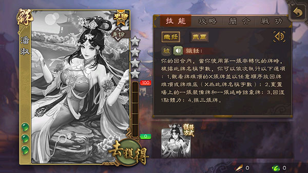 当其他角色于其自己的出牌阶段失去最后的手牌时,你可以与其各摸两张牌(每回合限一次)。若你摸的两张牌类型相同,则“织纴”改为回合外也可以发动直到你的下回合开始;若该角色摸的两张牌类型相同,其回复1点体力。