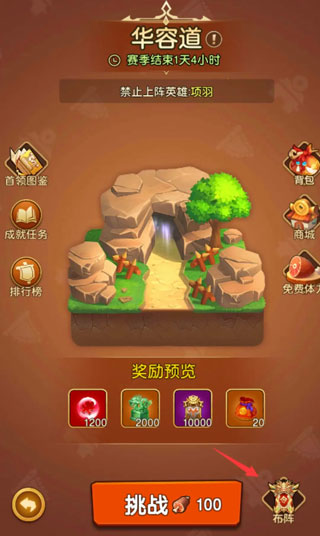 华容道界面点击布阵,可以在布阵界面选择英雄上阵,华容道每波结束会有华容币和华容令奖励