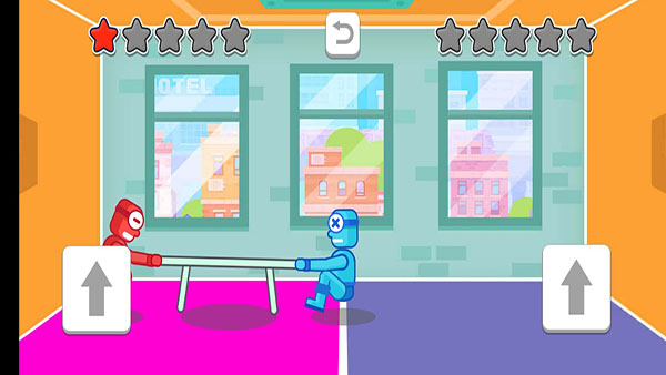 双人口袋大作战是一个简单有趣的对抗游戏。是的,你别笑,尽管它看起来很滑稽,但这真的是对抗游戏。游戏里有一个蓝色小人和一个红色小人,这种组合是经典而传统的对抗角色配对,所以接下来要做什么你懂得。你需要做的事情就是控制其中一个小人,然后将对方拉过白线。谁被拉过白线,谁就将失败,这很简单。