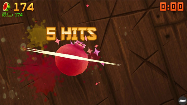 4、图标为苹果的Zen模式中,没有炸弹,只会不断出现水果,时间为1分半。在这一分半内谁因连击而切出的分数越高,谁就是胜利者。游戏不会因水果的掉落而失败。