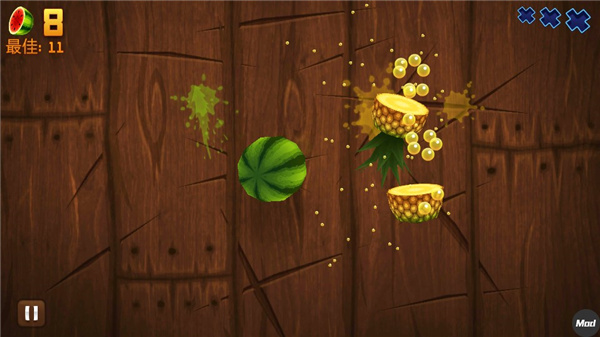 3、玩家需要不断的切开各种水果,如果三次机会用完了那就结束游戏了。